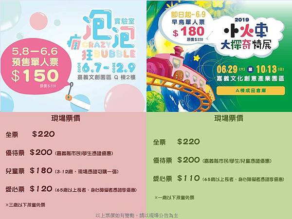 ▼嘉義小火車大探奇特展&瘋狂泡泡實驗室票價(本圖取自官網)