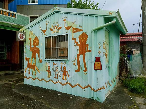 利用破舊農用小屋創作,繪上西拉雅的幾何、鳥、狗、馬及人物圖紋。搭配學堂前的檳榔兄、米酒弟接受祝福明信片,讓阿立母的祝福分享出去。