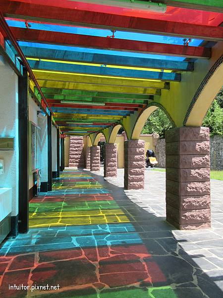 在廁所這面的屋頂上有紅藍黃綠的長條交錯,白天在陽光的照射之下,彩色光線映照在地面相當美麗!