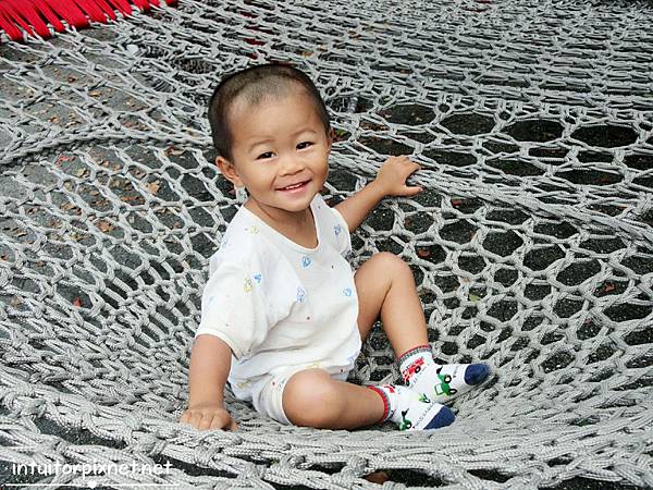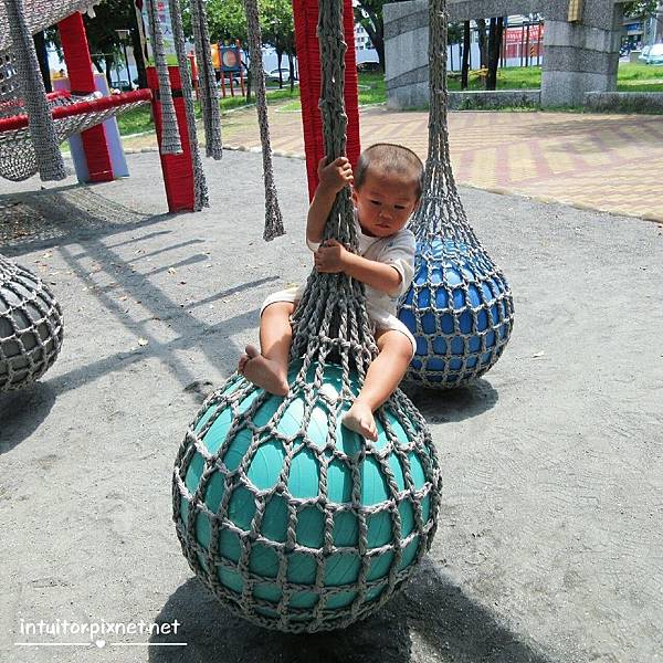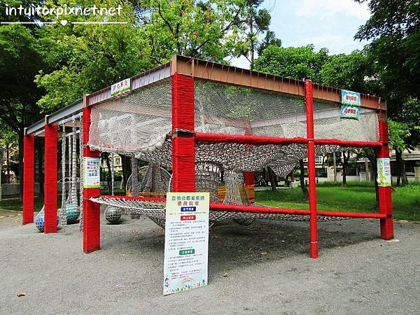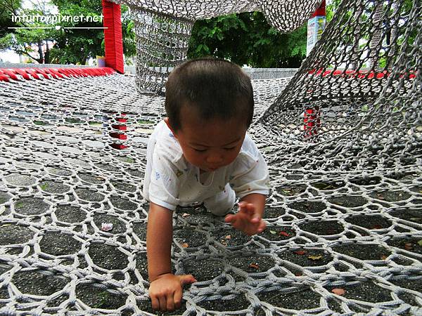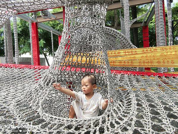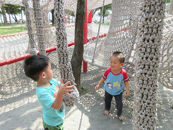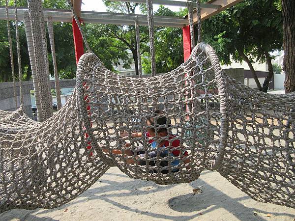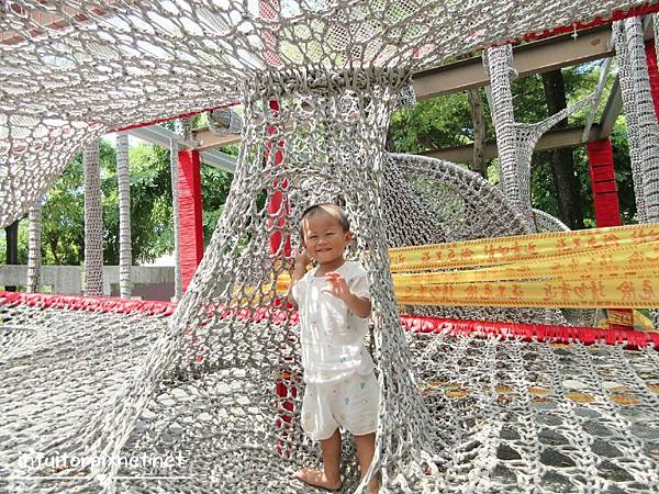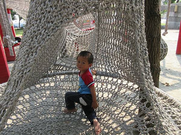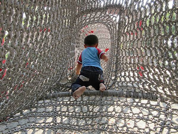 今年帶雞腿寶在北部玩了許多特色遊戲場,回到台南後明顯感覺到台南的特色公園建置速度沒有北部那麼快。現在偶爾還是會懷念北部密集的華麗公園。非常感謝台南還有一群為了孩子遊戲而努力的父母,台南特色公園的建置一直在努力進行中。這天帶雞腿寶來到了立德公園。立德公園的編織攀爬遊具是以公園內原有的H型網為架構編織而成,遊具中間有兩株樟樹,待其成長茁壯,孩子們在臺灣原生樹種樟樹的遮蔭之下玩耍,吸收它散發的芬多精,融入自然裡。