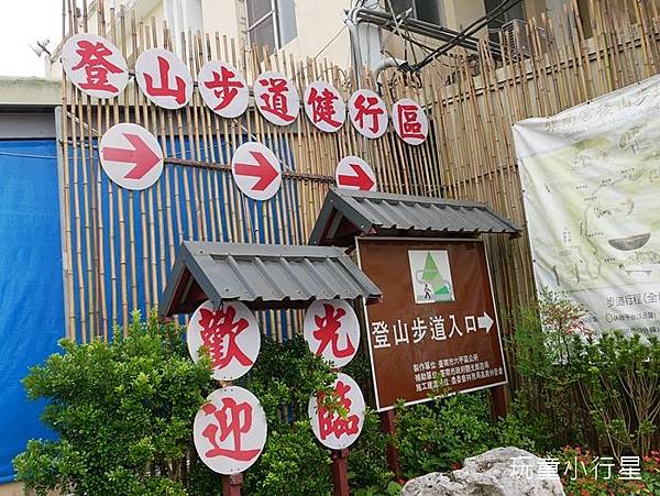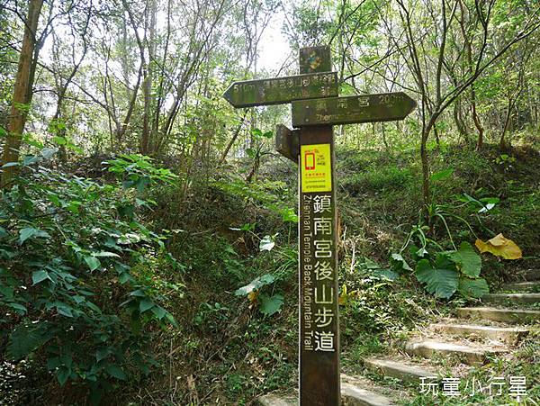 從停車場上坡,可以見到明顯的入口指標。到第一個分岔口約480m,我們往出口方向走發現有另一出入口約200m,坡度平緩,可以少走一些階梯,如果有幼兒隨行可以考慮往面向廟大門左側出入口進入。