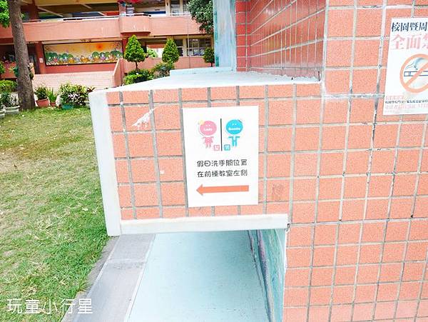 假日時國小廁所不一定會開放,或者只開放局部。正義國小好貼心還有貼上假日洗手間位置指標。這張指標貼在共融遊戲場旁,只要順著指標走就可到達廁所。外子大讚學校貼心,因為他剛好急著如廁。