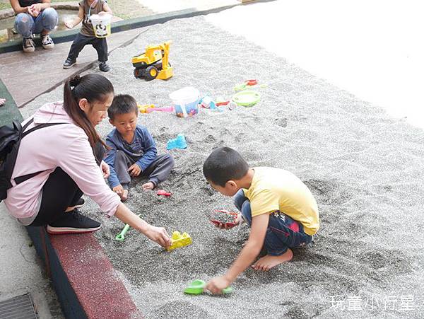 三月的高雄已經開始有炎熱的感覺,小朋友們都集中在有遮蔭的砂坑區玩砂。這裡的砂是小石頭的砂。