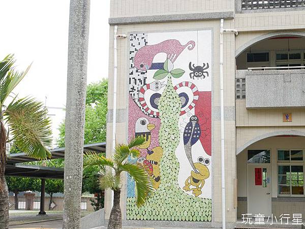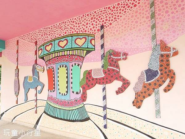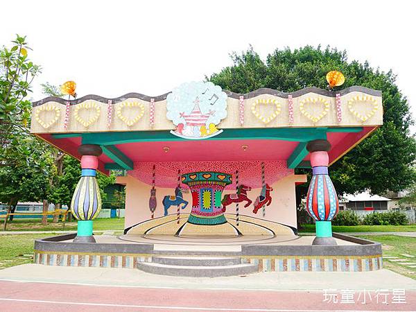 善化國小旋轉木馬司令台,由南藝大師生聯合打造。馬賽克黏貼製成,不管從哪一面看都很立體,繽紛的顏色,歡樂的氛圍,校園內的這座旋轉木馬司令台讓人印象深刻。