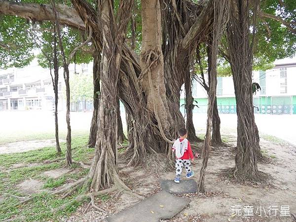 百年榕樹的氣根圍繞著主幹形成了自體迷宮,雞腿寶穿越氣根繞圈