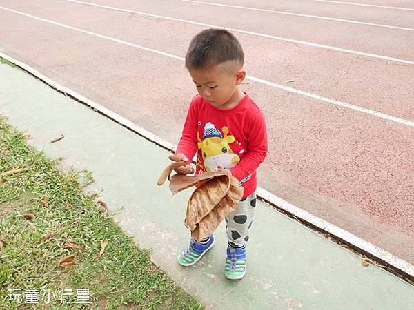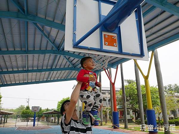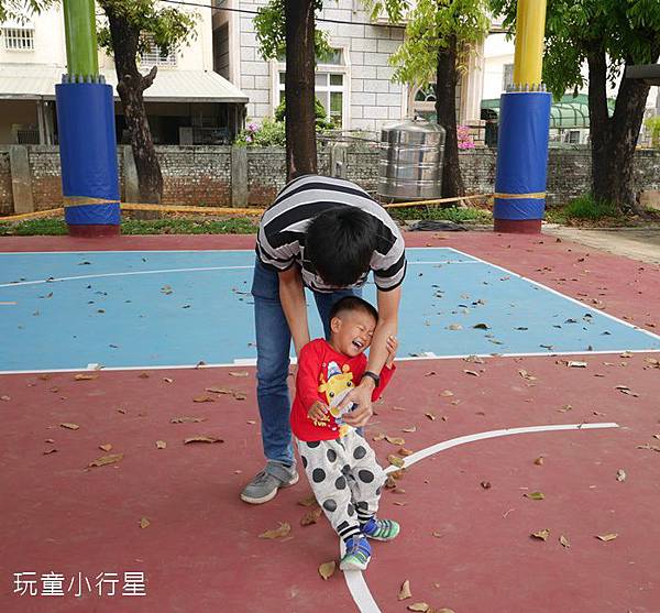 善化國小校園內還有讓人非常羨慕的風雨球場,球場旁的支柱有包裏緩衝墊。雞腿寶和爸爸在球場玩追追,笑容綻放。
