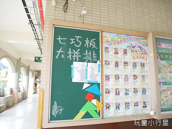 校園穿堂黑板上有七巧板,近期很愛玩七巧板拼圖的雞腿寶也想玩,可惜對他來說太高,這天我將他抱在身上讓他進行操作。