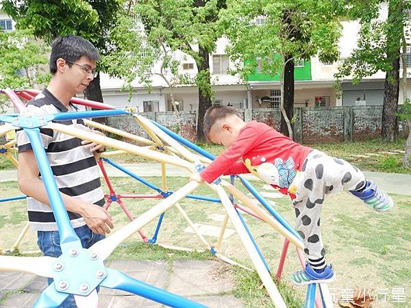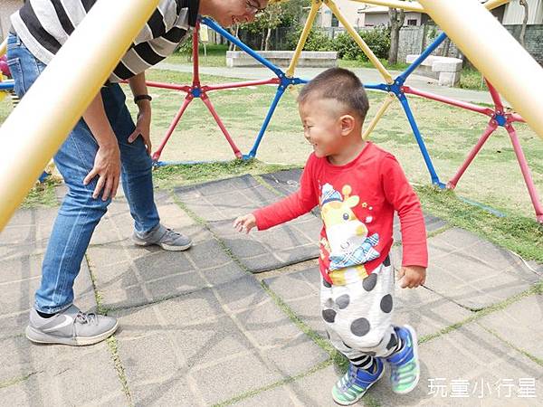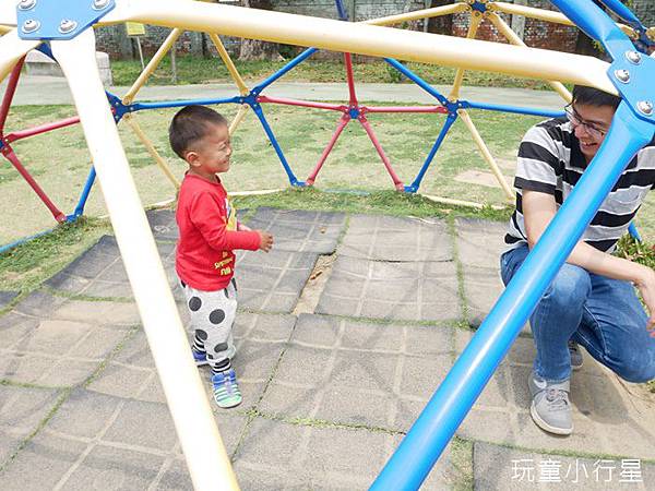 雞腿寶想挑戰這座半圓球狀的遊具,間距對他來說太大了。換另一種遊戲方式,和爸爸鑽到裡面玩耍。