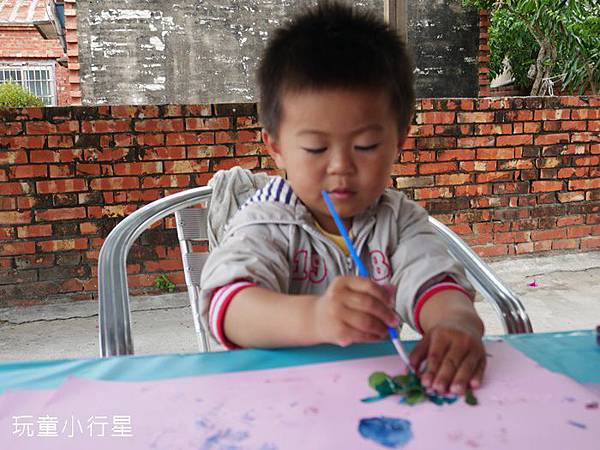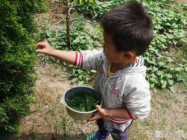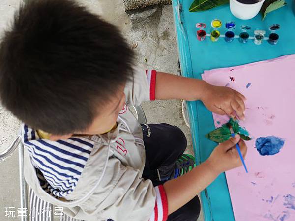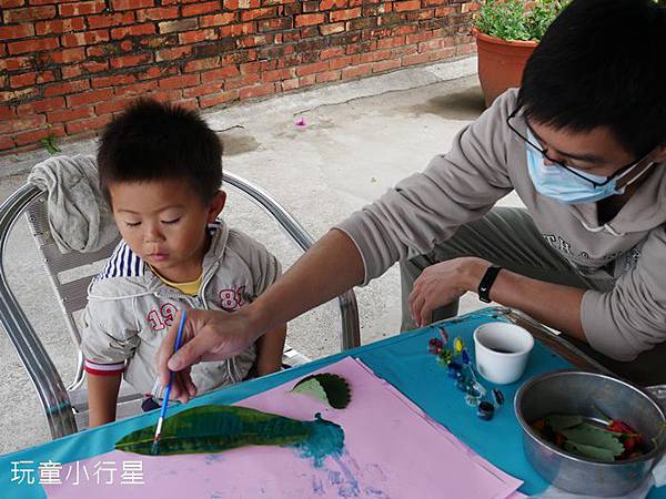 雞腿寶的阿公是位喜歡從事蔬菜、水果種植的人,鄉下老家的菜園以及漁塭旁都是他綠手指發揮之地。這天我們到阿公的菜園拔葉子,用水彩塗抹葉子,要來進行一場樹葉拓印畫。這個遊戲要事先採集葉子,可以順便認識常見的蔬果,也能夠練習小手操作。更進階一點,還可以帶孩去圖書館借本常見的植物圖鑑之類的,一起認識常見植物、蔬果。
