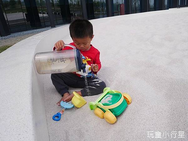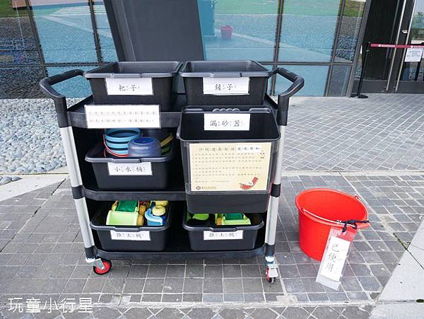 到故宮南院如果忘了帶玩沙玩具也沒關係,園區非常貼心的準備玩沙工具,可以自己到推車上取用,使用完整理後記得放回去待整理的水桶內。