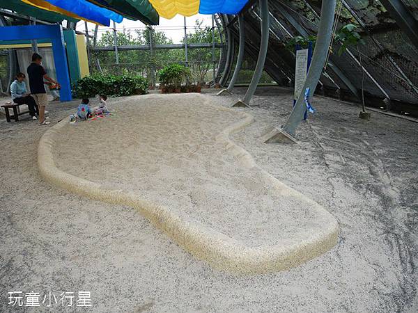 ★沙坑上方有遮陽布(後來園方有製作一個更棒的屋頂來遮陽),沙坑內 內置犀牛骨骼化石