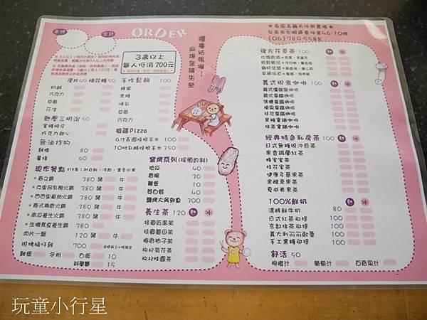 入園低消三歲以上一人二百元,可以參考下圖菜單。我們點了較簡單的飲料、鬆餅、口袋型pizza。可以事先說大約幾點用餐,以便備餐。