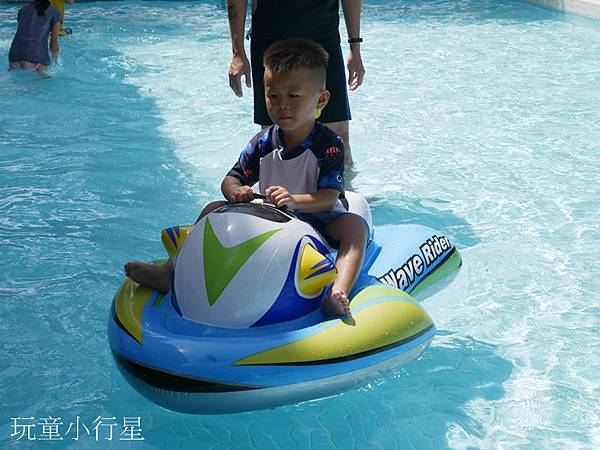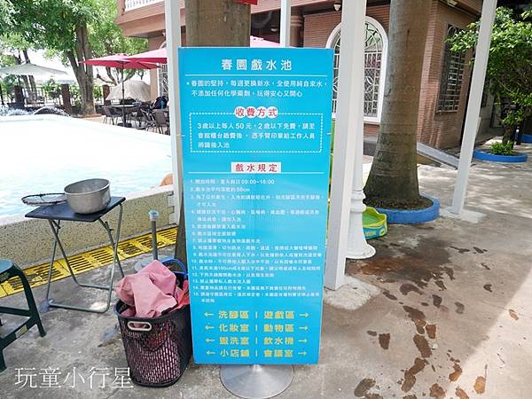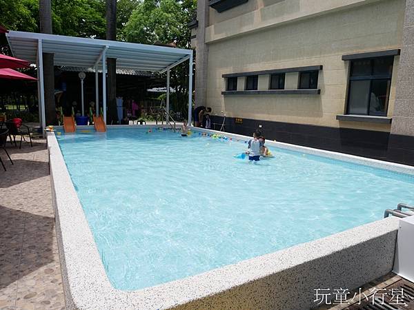 泳池區三歲以上需付費五十元,泳池深度大約五十公分。泳池內有放一些玩具、滑梯,入池前記得先沖腳。泳池後端有定時噴水裝置。