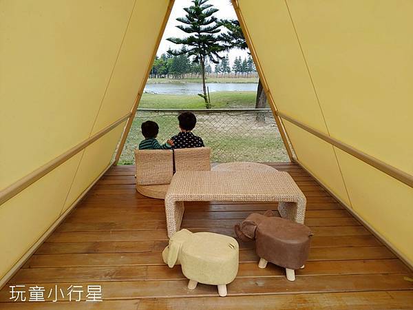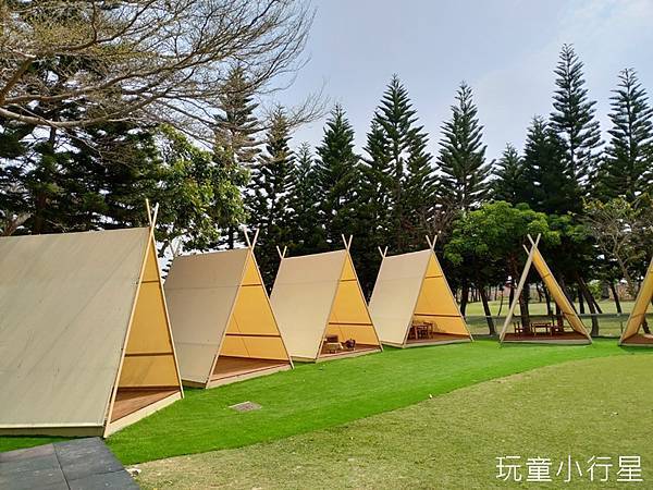 從用餐區往外看有一片乾淨草地,草地盡頭還有安置如同帳篷般的三角屋。