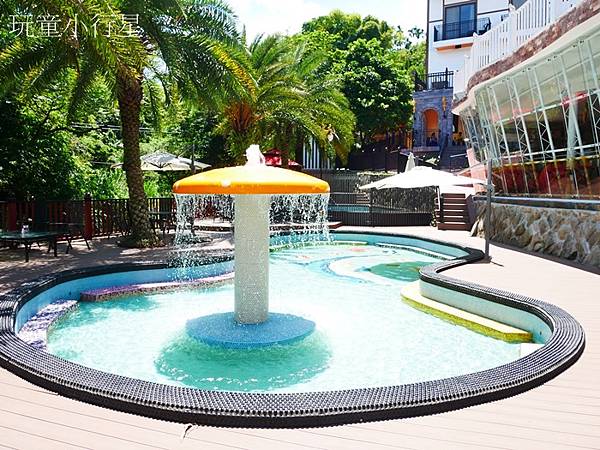 水池深度大約三十公分,蘑菇造型的水流設備落水不間斷。一旁就有座位可以休憩,座位上有餐廳菜單可以參考消費。入內可換泳裝或著一般衣服。