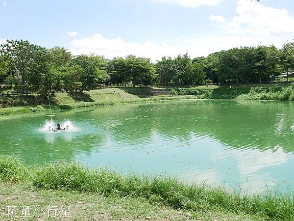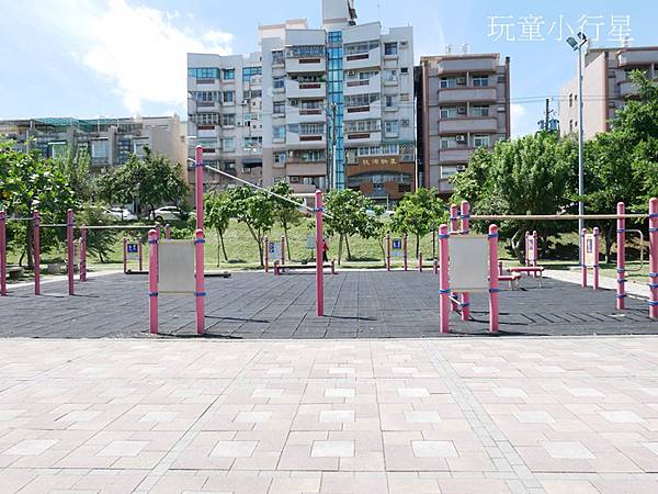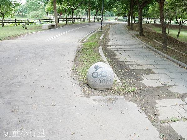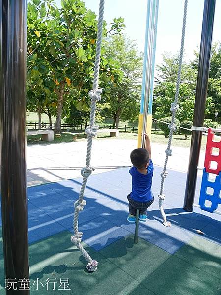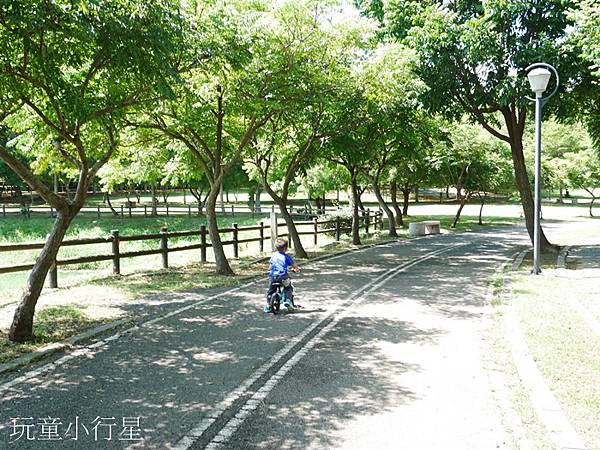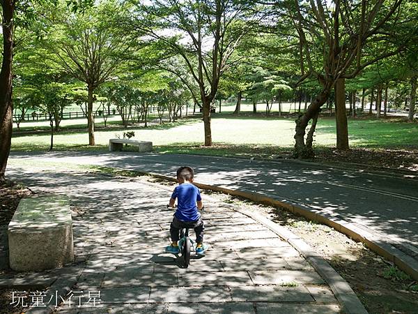 這天我們原本要到彌陀映月橋賞景,驅車前往行經映月橋時,看到日正當中,晴朗高溫的天氣讓我開始卻步。待車子往前開時發現這裡有處停車場,下車一看才知道是河濱運動公園(八掌溪親水公園一部分),公園內樹木成蔭,看起來讓Ryan在此玩耍比去映月橋上給日頭直晒來得好。是日撿到這處練習騎滑步車的好所在,不禁讓我欣喜萬分!
