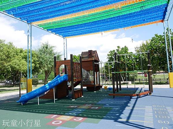 兒童遊戲區有簡易組合遊具,上方有遮陽簾。公廁就在遊戲區旁,公廁旁還有飲料自動販賣機。