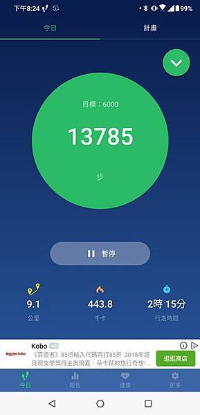 這天上午我在雙鐵綠廊自行車道行走的步數和公里紀錄。一口氣走了九公里,還有點意猶未盡。