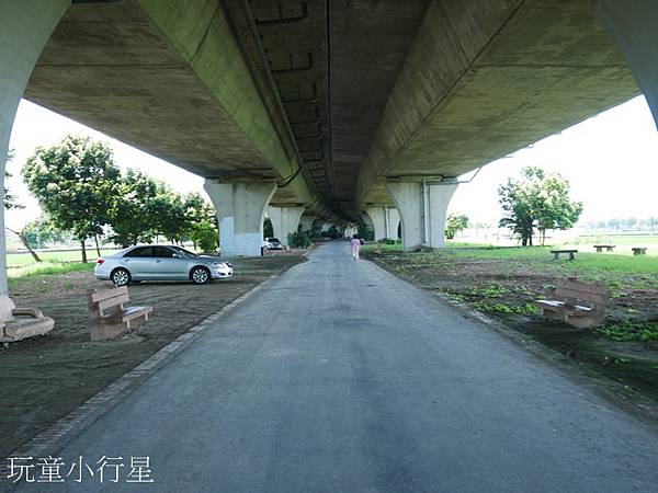 騎到了東西快速道路橋下立馬感受到涼爽氛圍,看到這裡有人在此健行、練習吹奏樂器、老人家在此歇息聊天。對比剛才一路上寧靜的田園風光,不禁讓我覺得陸橋下熱鬧多了。