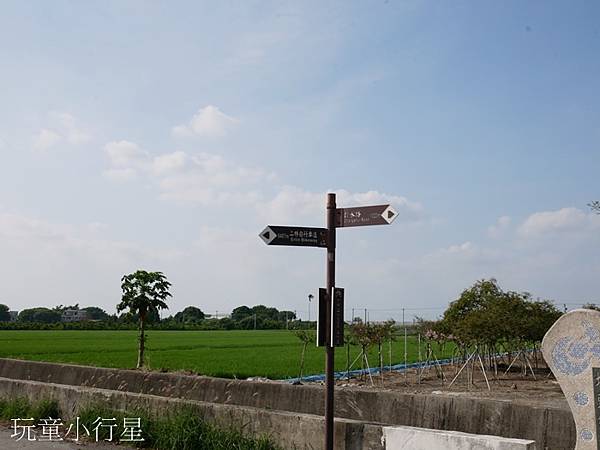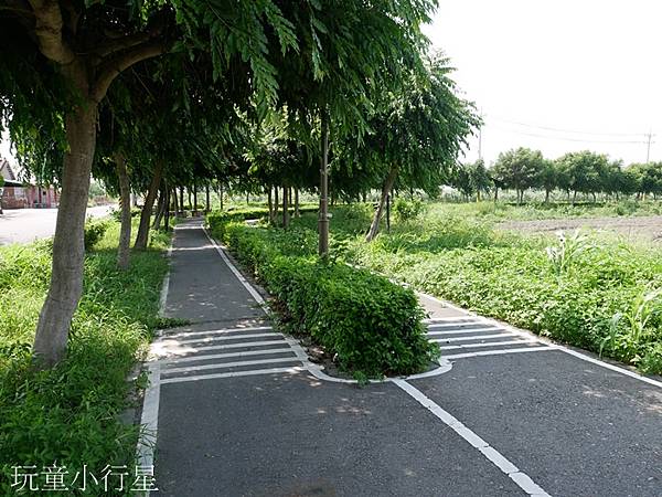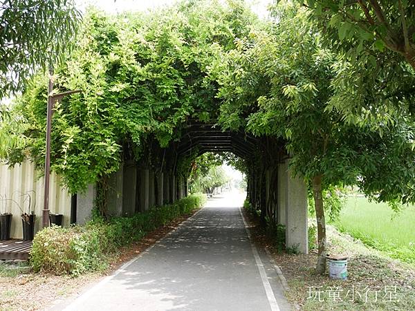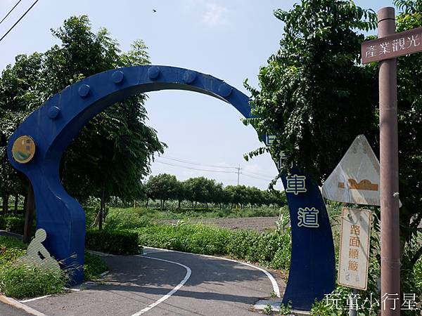 此自行車道最讓我覺得頭痛的是,出發前我在網上找尋不到詳細的起點位置,只能從歷年來的自行車節文宣之中得知位於豐崙運動休公園(遊記: https://0rz.tw/R6il8 )附近。我在公園繞了一個之後找不到自行車道。從相鄰的田園看到不遠處有一排樹木,我強烈懷疑就是那一條。從公園(對面是大統幼兒園)出去右轉直行,看到馬路上有腳踏車圖案心中幾乎已經快確定自己的猜測是對了。步行約七八分鐘後看右側有自行車道的招牌拱門,我們就先從這段開始騎乘囉。