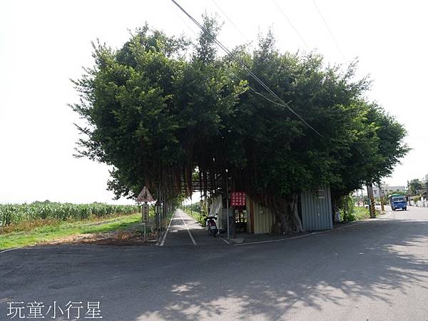 看到榕樹下早餐店後行經路口有一小段車道旁種植了一大片人造林,看起來是台灣欒樹,再往前走是紅綠燈。我們到此折返往原車道拱門對面路線騎乘,此段路線可以接到明道大學綠色廊道,環狀接到舊濁水溪(東螺溪)自行車道。
