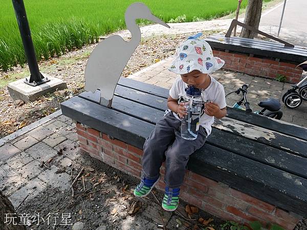 Ryan喝水中。車道旁的休憩站,常常可見到以白鷺鷥為意象點綴。