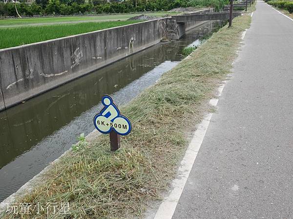 經過水圳,此路段幾乎沒有路樹。一旁路燈上有埤頭自行車道的意象設計。看到6K+500M的指標後,我們再前行約500m,就折返回原處,準備上車回家。
