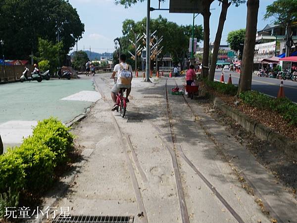 我們的騎乘方向是面向火車站的右側移動(民生路),沿路有明確自行車道指標。整個環鎮自行車道有部分路段沒有明顯分隔,騎乘在馬路上要注意安全,因此我個人認為較不適合讓兒童自己騎乘。如果小朋友還是想騎可以騎有分隔的路段,從軍史公園到集集火車站這一段有和馬路做分隔,一路上有小葉欖仁樹蔭遮蔽,車道旁就是火車軌道,幸運的話還可以和火車追風。(綠色隧道這段也是和火車平行)