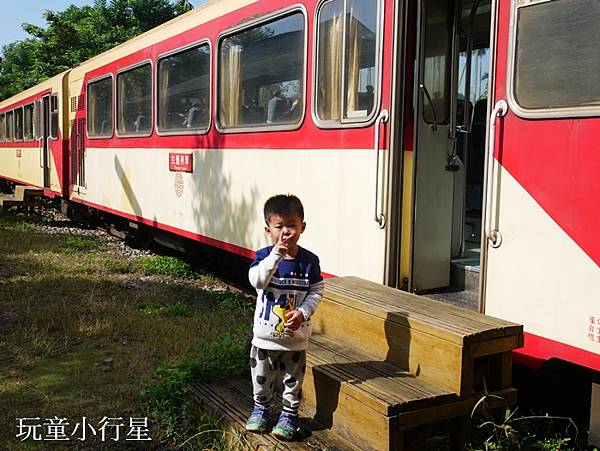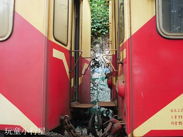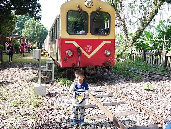 762軌距上的森林火車,車廂內一排是三個座位。由於我們是搭區間車到嘉義車站,從一般火車到森林火車,我兒子對於車廂內部空間就有很明顯大小的感覺了。林鐵上的廁所也較小間,如果是要帶嬰兒隨行的話,我強烈建議一定至少要找一個朋友或家人陪你參加,這樣子你要上廁所時有人幫你顧小孩比較方便。帶嬰兒隨行以揹巾背小孩為主,不要想說要帶推車了,除了嘉義車站月台外,要在其它林鐵車站上下車就很不方便了,林鐵車站沒有月台,上下車都是踩著在軌道旁設置的簡易樓梯。