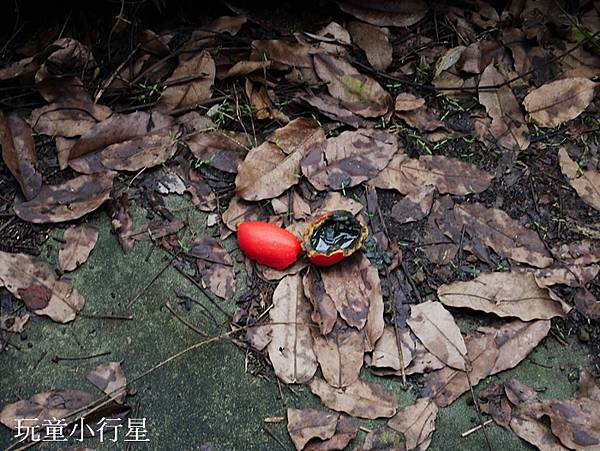 這時看到導覽老師在地上拾起了一果實,這果實叫槭葉瓜樓,果實可食,可藥用。剝開來後內部果肉黑黑的有點像黑灰色泥土泡水的色澤。我和兒子都不敢吃。