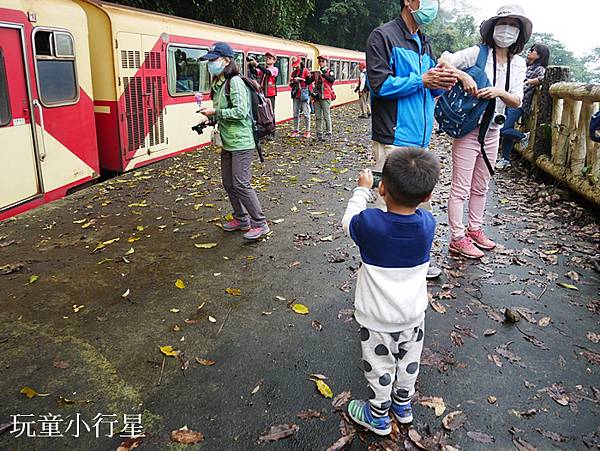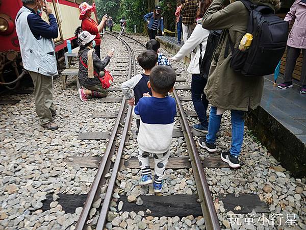 遊客們下車又開始進入瘋狂拍照模式,我兒也拿起相機朝DL-46列車方向拍照,從背後看他的架勢感覺挺可愛的。