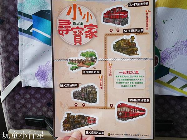 接下來要準備搭火車下山了,最後的行程是嘉義東洋第一制材所、車庫園區。列車長發了一張問券填寫,有送一張貼紙。貼紙上所列的車種都在車庫園區,待會到站後再下去找找。