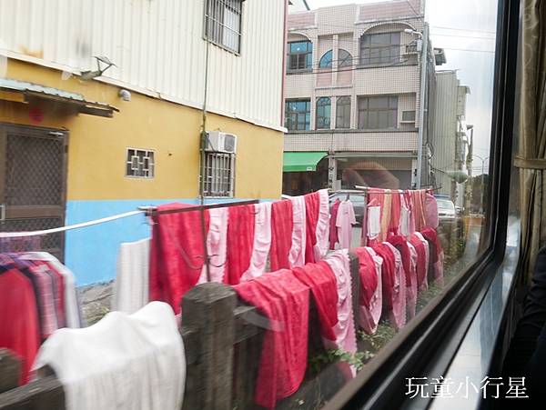 這次我坐在靠窗的一人座位,抱著兒子一路看窗外景色。從嘉義火車站出發,車輛慢慢行駛到森林西路,行經嘉義東洋第一制材所、車庫園區、嘉義市文化局、北門車站。接下來車輛會行駛到一段兩側都是民宅的路段。沿路時常可見居民在軌道旁的柵欄晒棉被,導覽員說以前蒸汽火車行經時都要先按喇叭讓民眾出來收棉被,不然棉被會被煤碳染到變成梅花鹿的外觀啦。不禁讓我想起《好髒的哈利》裡,哈利狗跑去玩耍,行經火車旁天橋,被蒸汽火車的煙燻染成從原本一隻白底黑點的狗變成黑底白點的狗。