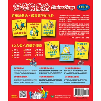 書籍本身是平裝本,A4大小,輕巧好翻不厚重。好奇猴喬治一套總共六本,《好奇猴喬治》、《好奇猴喬治去工作》、《好奇猴喬治騎腳踏車》、《好奇猴喬治得獎牌》、《好奇猴喬治上醫院》、《好奇猴喬治放風箏》。