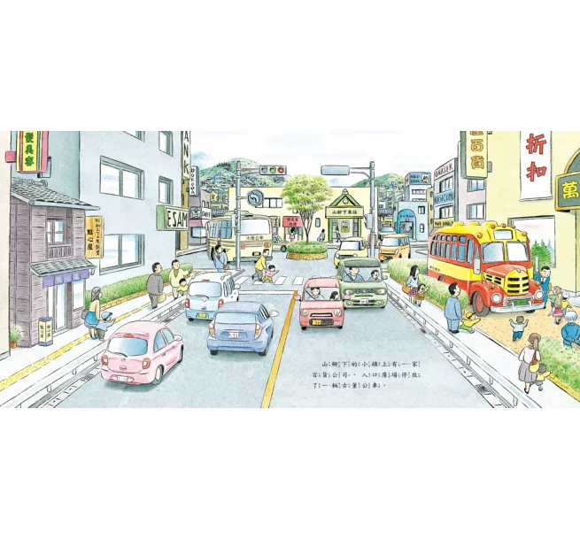 眼尖的小讀者們是否發現了書頁開端山腳下車站前的場景和小拓開公車時的景色有點熟悉,又有點不一樣。發揮你天生的偵探能力,找找看哪裡一樣,哪裡又不一樣?