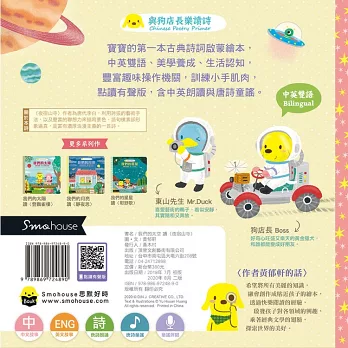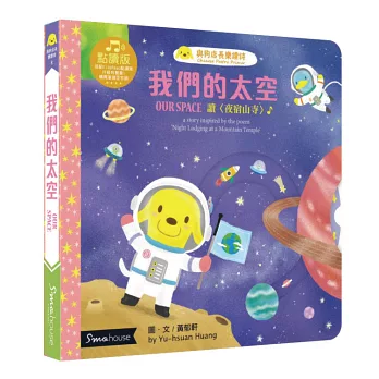 《我們的太空(點讀版-2020修訂版):讀〈夜宿山寺〉OUR SPACE》,由Smohouse思默好時出版。唐代詩人李白對於璀璨夜空的描寫,作者黃郁軒將此詩場景轉化為狗店長和朋友搭太空船到外太空,看到了近在咫尺的星星,似乎觸手可及。與狗店長讀詩這一系列的繪本是我比兒子還喜歡的一套書籍之一,內頁有操作機關可推、拉、轉、中英雙語、點讀功能。這套詩能品味讀詩之美,搭配可愛的圖案讓幼兒容易理解詩中意境。