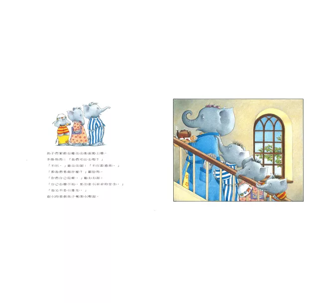 這個故事裡的場景根本就是育兒生活常見的狀態,看到象媽媽想要安靜五分鐘卻一直被小象干擾,看到畫面讓我忍不住發笑,頻頻點頭心中稱是。