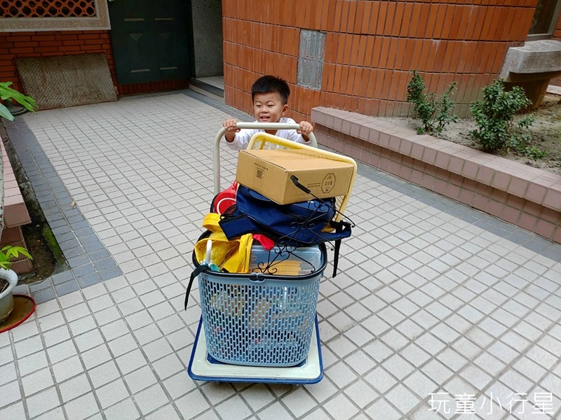 這次搬家兒子也幫忙使用推車運送過幾趟物件,平時在家老是喜歡拿著他的學步推車運送布偶、鍋子,現在終於有實際推運物品的機會了。
