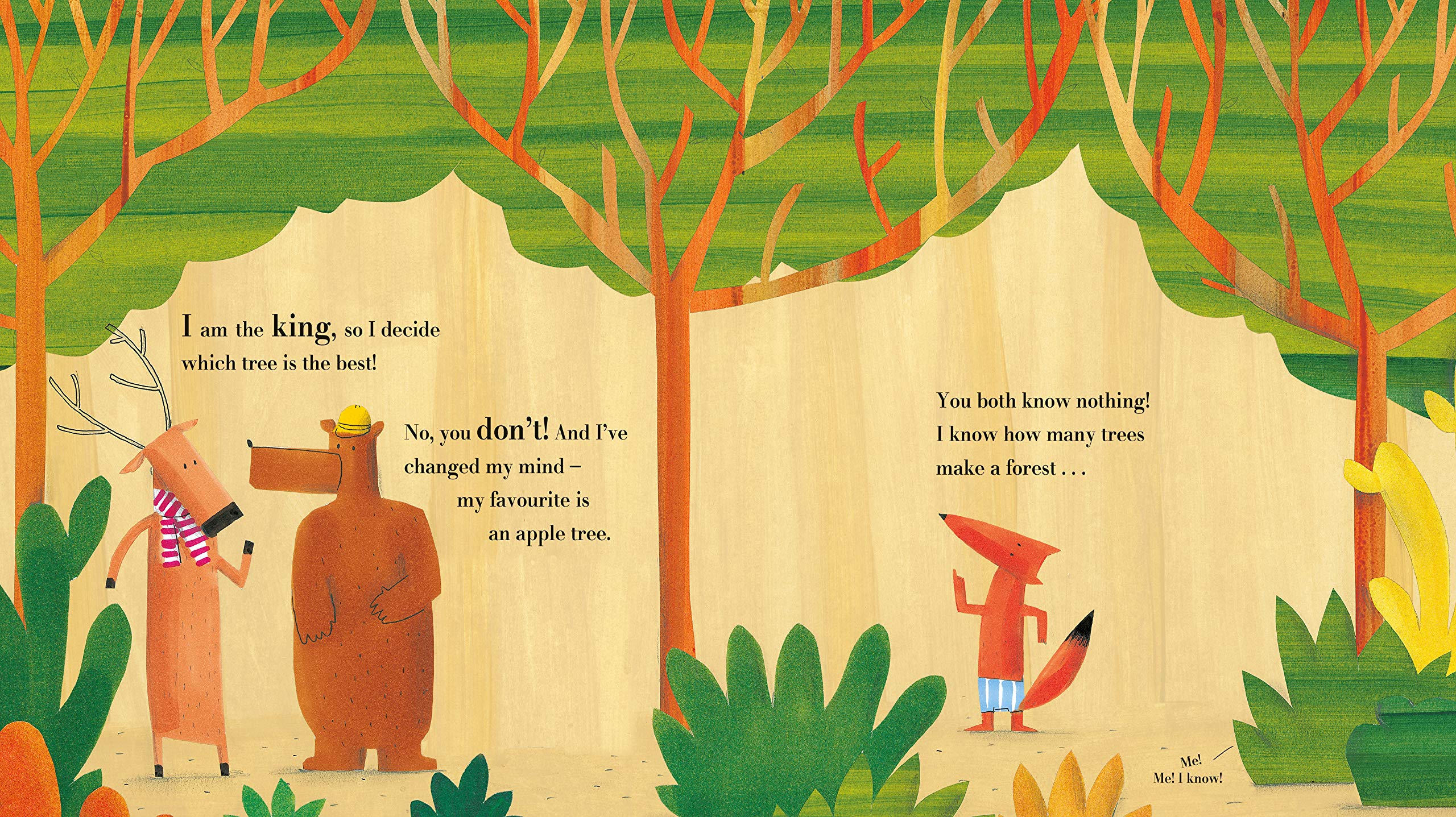 How many trees make a forest?6隻動物分別說出了牠們的想法,我們會看到動物發言的順序以體型大小為排列,鹿、熊、狐狸、兔子、老鼠、螞蟻。