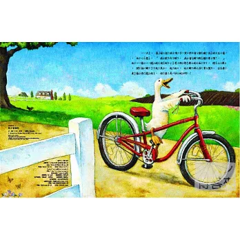 一看到書上封面鴨子一臉神氣的騎著腳踏車,兒子的目光馬上就被吸引了。這是一本畫面讓人一看就很難忘的故事。