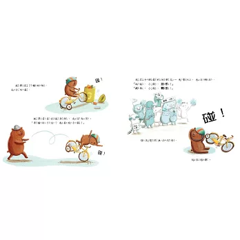 牠從圖書館借了一本《學會騎腳踏車只要4天!》,按圖索驥,照著步驟學習。到底學會騎腳踏車的方法是什麼呢?