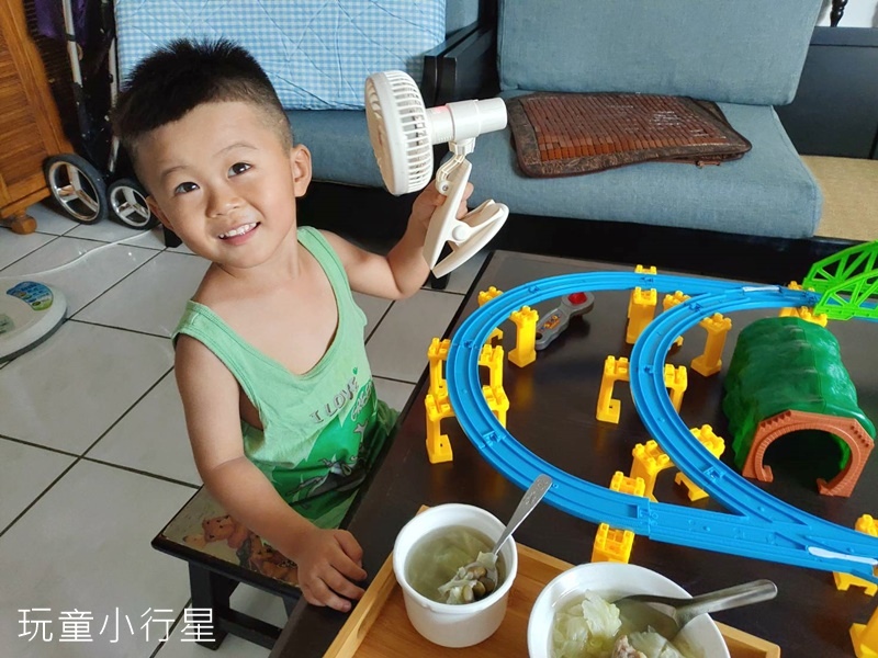 趁著來電後快速幫兒子洗澡後,讓他使用USB電扇吹涼身體,拿出手電筒照明。