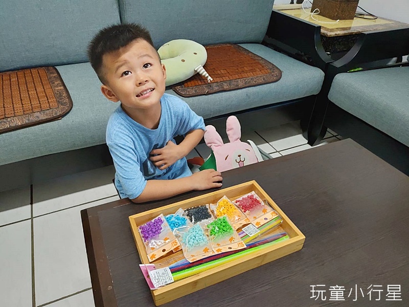 兒子在創作時,還一邊跟我說,學校也有串珠,是作成手鍊,他說他還沒有輪到做這樣工作。