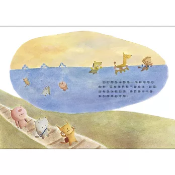 牠們卻沒有注意到先天身材上的差異,我們可以一同和孩子看著畫面討論狗、豬、貓是否踩得到泳池底部。
