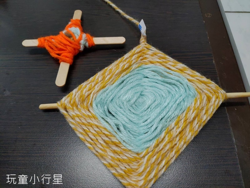 比十字編更簡易的毛線編織,可以將木棒固定成交叉狀,讓幼兒進行毛線繞圈纏繞。