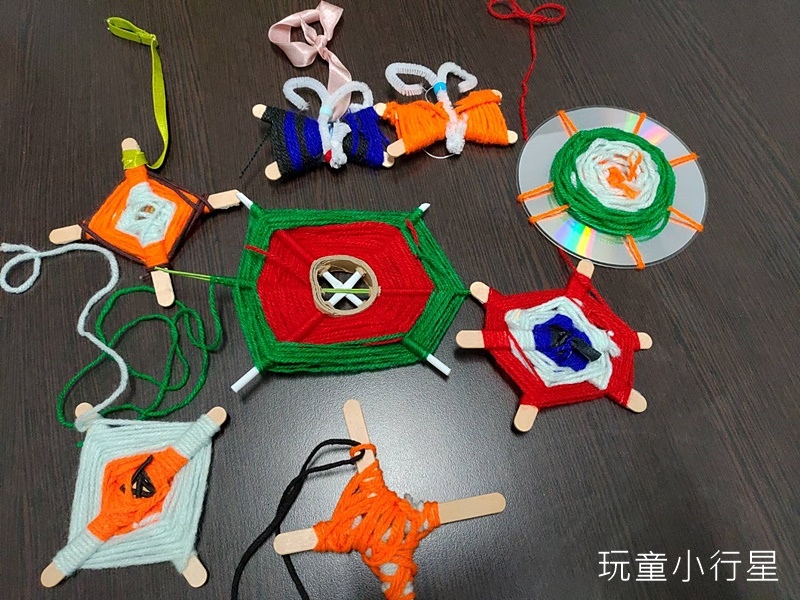除了可以用先將木棒做固定成十字編織,也可以增加木棒數量、或者運用紙盤、光碟片…等素材來做編織變化。