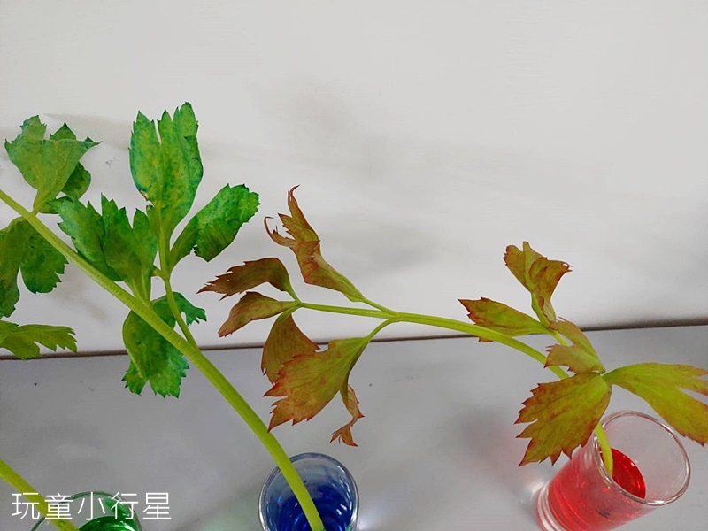 把芹菜剪三小段分別放入滴有色素水的透明容器裡,接下來就靜待芹菜吸水後產生的變色狀況。
