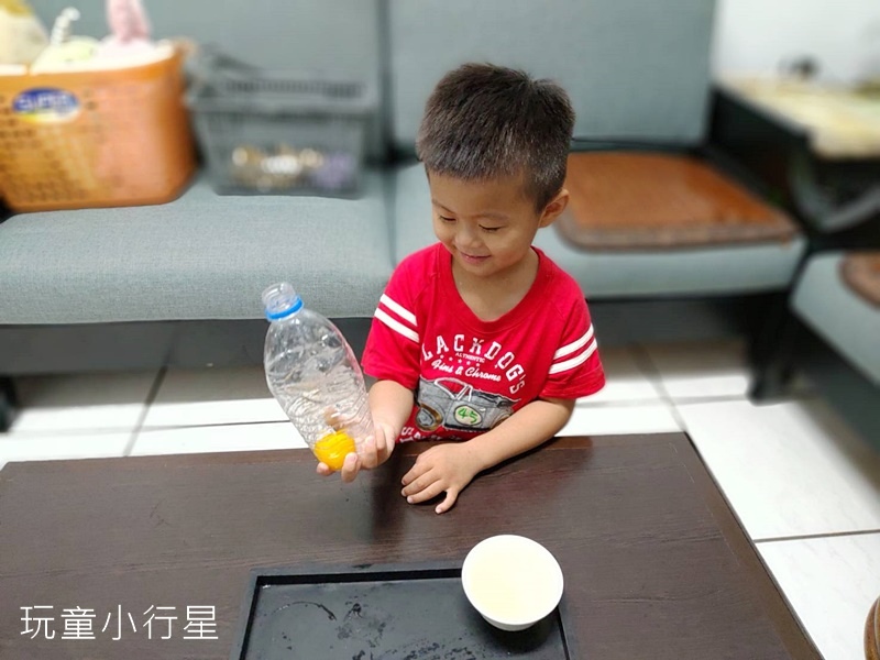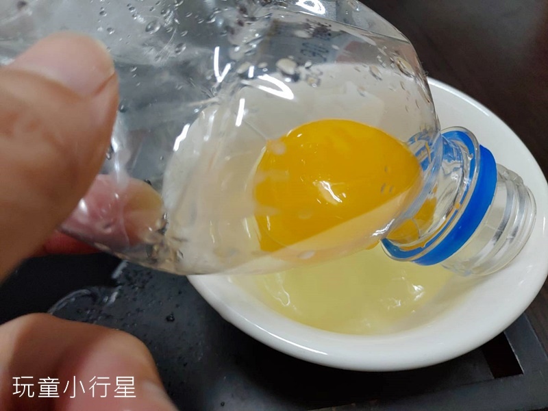 3.接著擠壓寶特瓶馬上把瓶口靠近蛋黃,手再慢慢鬆開寶特瓶,這時就會看到蛋黃被吸進瓶子裡了,瓶口靠著碗稍微讓蛋白慢慢流入碗內。