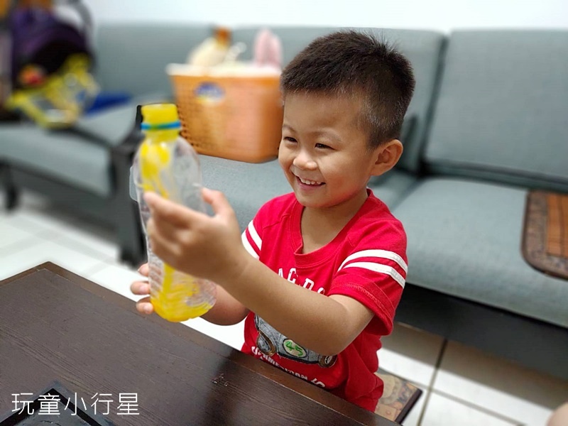 我讓兒子自己做一次,但他吸上來的蛋都變散了,他一副非常有趣的模樣。
