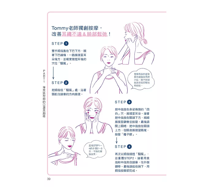 練習正確坐姿訓練臉部肌肉、調整呼吸、消除浮腫、消除抬頭紋、強化眼神力、緊實眼周、預防黑眼圈&皺紋、改善臉頰鬆弛、豐潤美脣操、緊實嘴邊肌肉、打造鮮明下巴輪廓、讓臉部更對稱、全臉伸展操、重置肌肉歪斜回正、